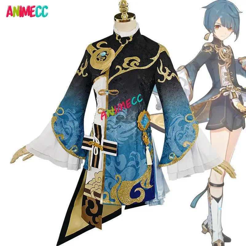 ANIMECC XingQiu Cosplay Costume Wig Game GenshinImpact Xing Qiu Cosplay Earrings Halloween Party Outfit for Women Girls